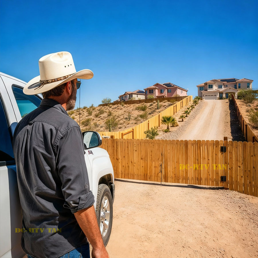 A flash of wood. A shape that didn’t belong. At first I thought it was a mirage. The kind you get after driving too long in heat shimmer. But it wasn’t. A fence. A new one. Tall, fresh cut cedar running where my old split rail fence had been. And behind it, rooftops, three of them. Fresh stucco, pastel paint, tile roofs gleaming like they had been imported from Scottsdale.