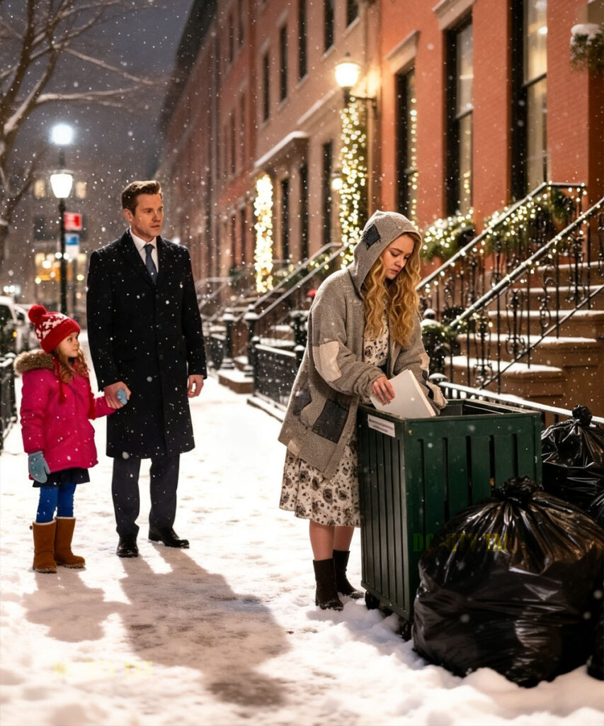 She looked back at the trash, her fingers brushing aside wrappers and empty boxes. I’m looking for something, she continued, her voice softer now. Something important. Daniel hesitated, then asked, “What could be that important?” She paused as if deciding whether he deserved the truth, then answered in a whisper that felt heavier than the falling snow. “A drawing.