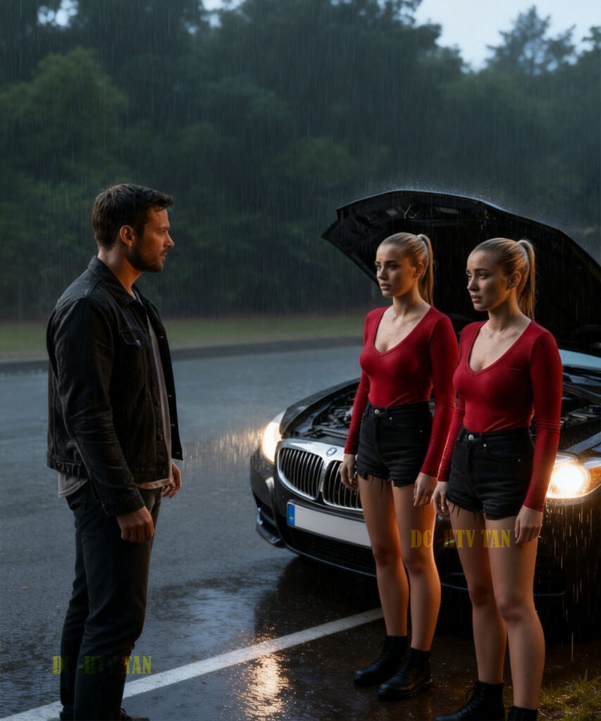 The storm hit hard. rain hammering his windshield like bullets. Lightning cracking the sky wide open. He just wanted to see Alice, hold her, remind himself why he was killing himself day after day. Then he saw them. Twin girls standing in the rain beside a car that cost more than he’d make in 5 years, stranded, scared, waving for help.
