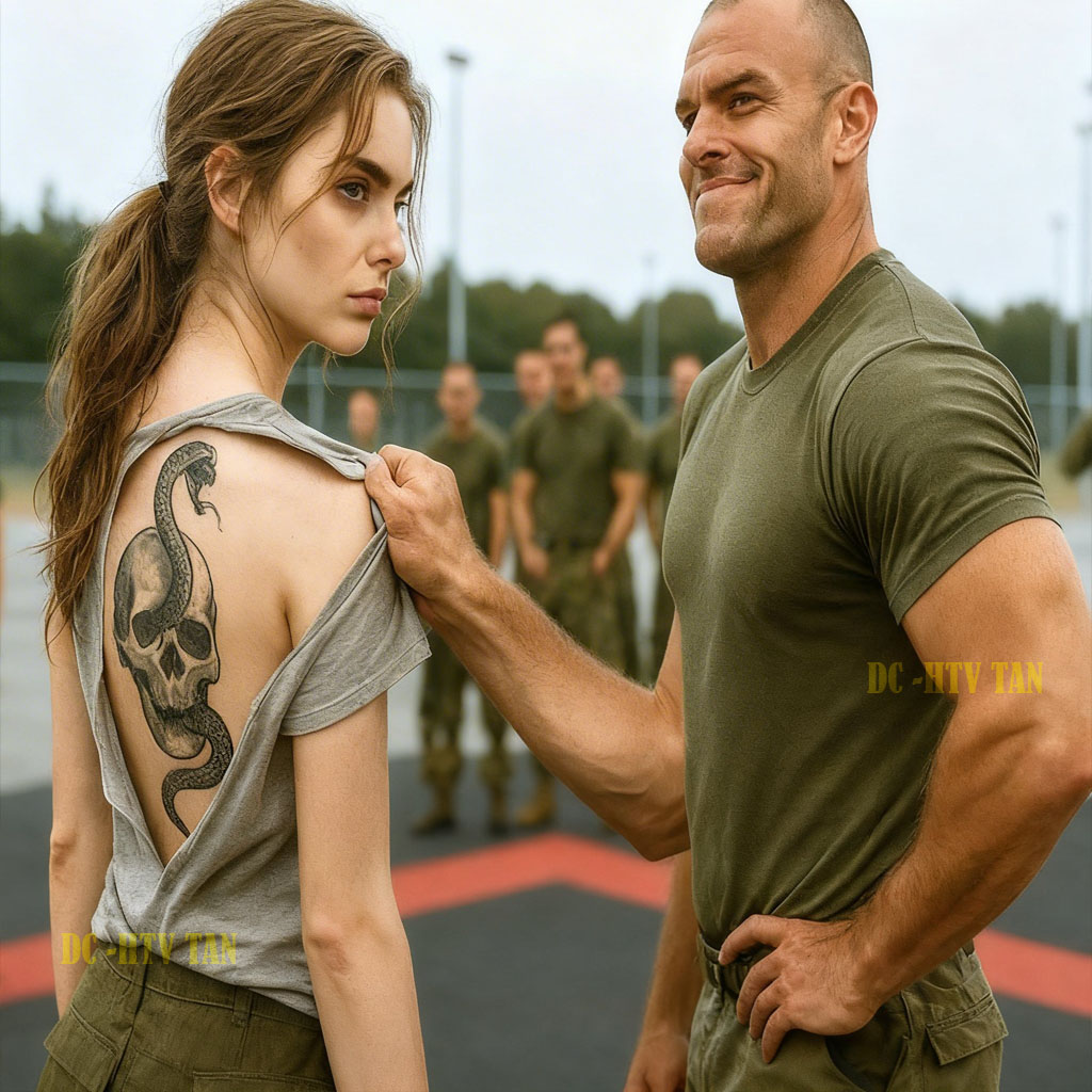 He stood in the middle of the yard, his fists clenched, his voice echoing. “So, what if she has a tattoo?” he shouted. “Prove it in a real fight.” The cadets looked at each other unsure. Olivia stopped walking. She turned her eyes cold and said, “If that’s what you want.” She didn’t fix her shirt, just let it hang, the tattoo still visible.