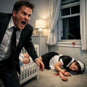 On the floor, wrapped in a thin blanket, was Ava Thompson—his Black maid. Her uniform was wrinkled, her hair messy, her cheek pressed against the carpet like she’d collapsed there. One arm was extended protectively toward the crib.