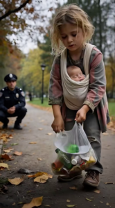 Up ahead, beneath a canopy of gold and rust-colored leaves, a tiny figure shuffled forward on bare feet, each step landing on cold concrete. She couldn’t have been older than five. Her blonde hair was matted, clinging to tear-streaked cheeks. In her small hand, she dragged a ripped plastic bag filled with crushed cans and bits of trash.