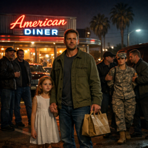 What unfolded next was a journey of courage, healing, and a bond no one saw coming. The sky over Harper Junction glowed the way only small town evenings could soft amber light folding into deepening blue. The neon trim of the American diner flickering alive like it had a pulse of its own. It was the hour between dinner and nightfall when the world slowed just enough to let a man breathe. Dylan Mercer lived for this hour, not because it was peaceful, but because it belonged to his daughter.