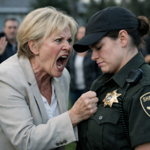 Her eyes landed on Karen with an icy focus that didn’t belong in suburban daylight. It wasn’t anger the way civilians show it. It was assessment. Distance. The kind of stare that made you feel like you had wandered into a room you weren’t qualified to enter.