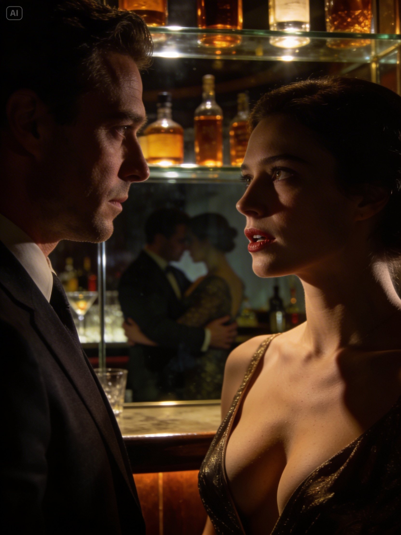 I excused myself and moved toward the bar, needing a moment where no one expected anything from me. The bar ran along the side of the room, partially hidden by tall arrangements and backlit bottles. The bartender polished glasses. Someone laughed nearby. The baseline of the music thumped softly through the floor. I stepped closer and saw them.