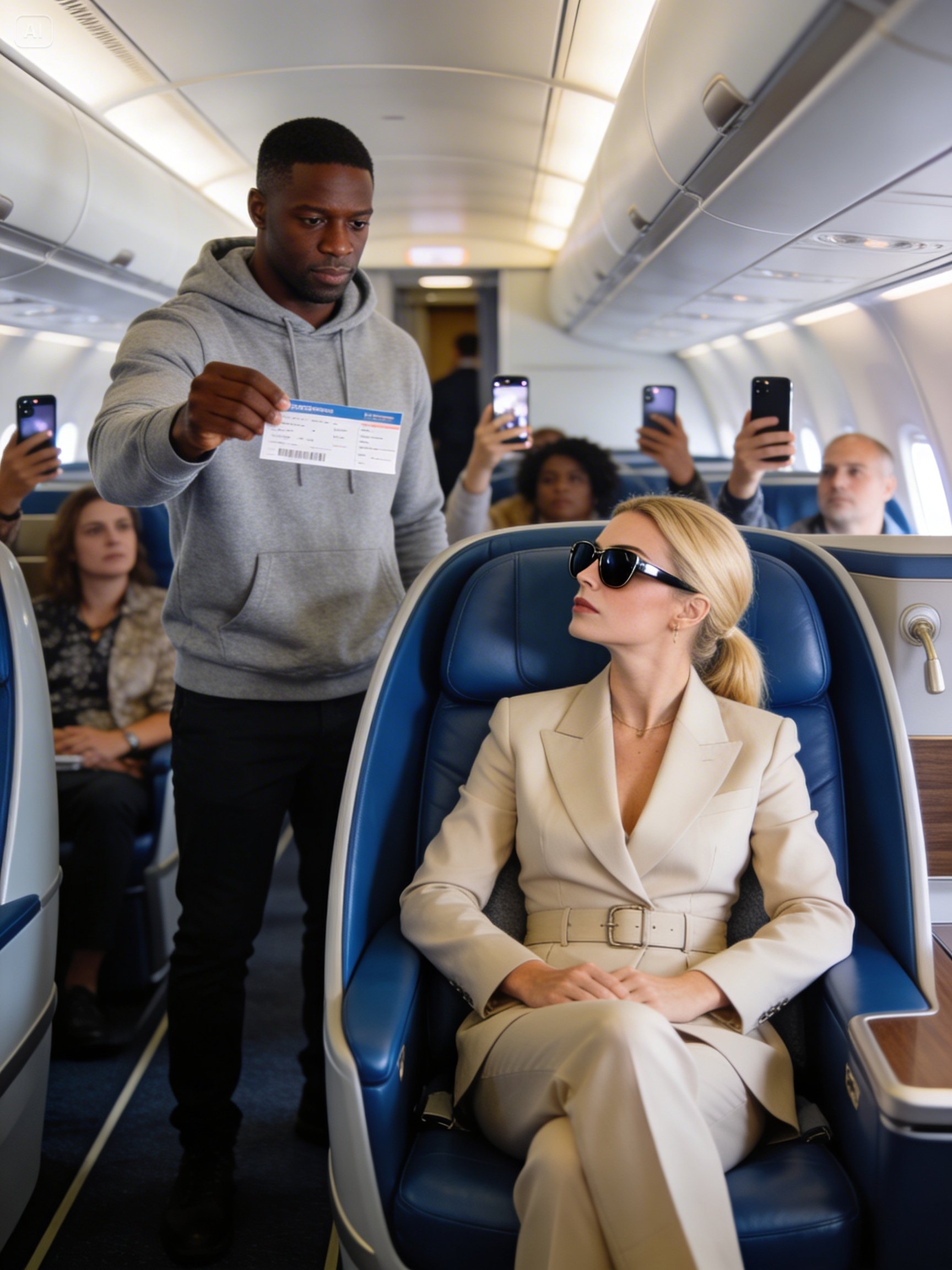 Karen smoothed her Chanel skirt, claiming his armrest. Some people forget where they belong. Marcus stood hunched under the low cabin ceiling. His plain hoodie and faded jeans screamed economy class. Her diamond bracelet caught first class lighting as she adjusted herself in his warm leather seat. Phones lifted around them. A teenager went live on Tik Tok.